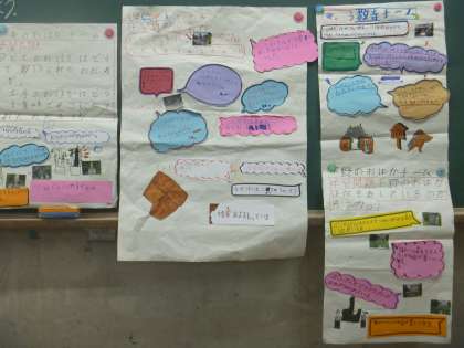 今までの学習を模造紙にまとめたものを発表し合いました。みんなに伝えるために、吹き出しを上手に使ったり、ペンで色付けしたりなど、たくさんの工夫が見られました。