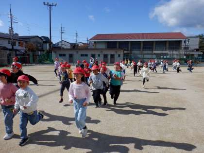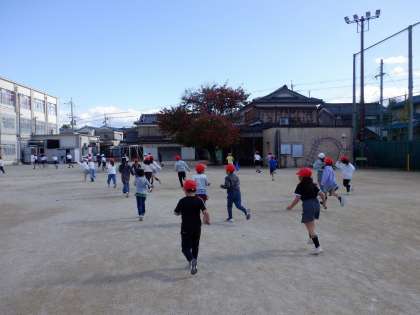 中間休みのかけ足運動の様子です。「マラソン、したことある!」と言いながら、張り切って走っている子が多かったです。5分間走り続けると、体がポカポカあたたまりました。