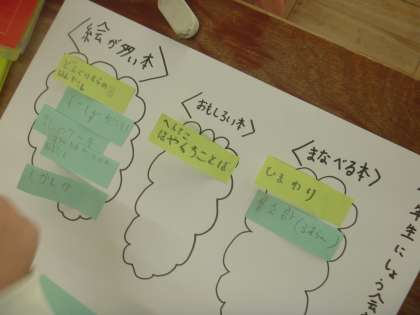 出た意見を画用紙に仲間わけをしながら,話を進めていきました。仲間分けの名前も自分たちで考えて整理することができました。