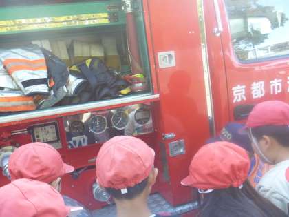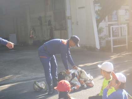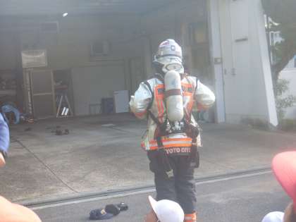 実際に火事が起きたときにどのように出動するのかを教えてもらいました。現場に向かうまでの一分一秒が大切です。