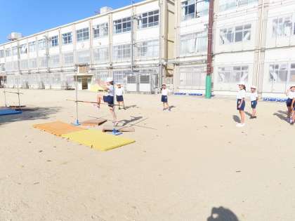 体育の学習で高跳びをしています。初めは、70センチメートルぐらいから利き足を確認したり、5歩か7歩のどちらが跳びやすいか調整してチャレンジしています。
