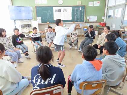 新しい係りの仕事が始まりました。遊び係の子ども達が、なんでもバスケットを呼びかけ、みんなで楽しんでいます。
