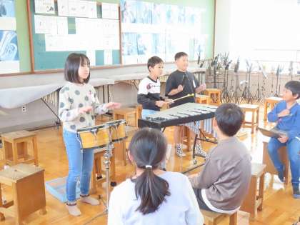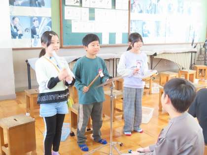 皮が貼ってある楽器、金属でできている楽器、木でできている楽器の音の特徴を生かしながら演奏をしています。友だちのグループの音楽を聴いて温かい拍手が印象的でした。