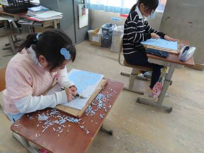 版画の彫が進んできました。メインの自分もつが彫れた子どもは、背景の彫に入りました。もうすぐ印刷です。そんな風に刷れるのか楽しみです。