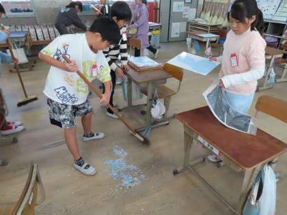 版画の後のごみの量は、すごいです。机のうえのかすを床に落とし、みんな楽しみながら掃除をしています。教室の床は、もと通りピカピカになりました。