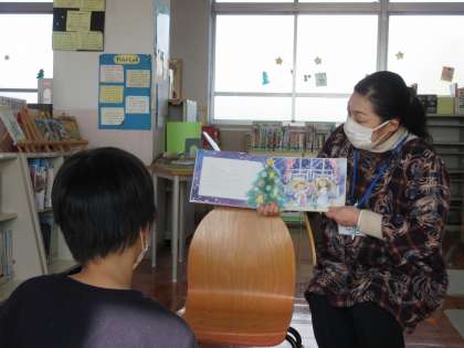 図書館司書の木曽先生に、「クリスマスにくつしたをさげるわけ」という絵本の読み聞かせをしてもらいました。