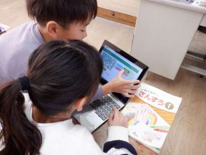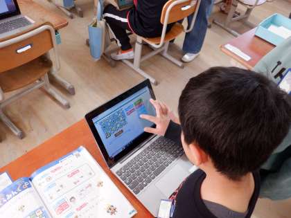 算数「わくわくぷろぐらみんぐ」の学習でギガ端末を使いました。「うえにすすむ」と「みぎにすすむ」を組み合わせて、ロボットを進ませる活動をしました。「ここに行きたいから・・・こう動かせばいい。」と、しっかり考えていました。