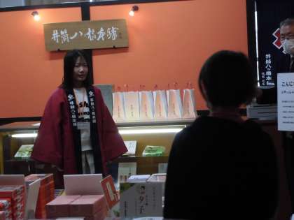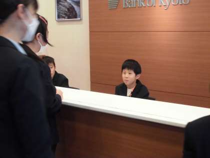 京都銀行では丁寧にお金の受渡しを体験しました。井筒八ツ橋では、あいさつに気を付けて接客をしました。みんな緊張の様子です。