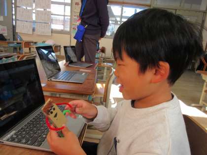 ダンボールで「すきまちゃん」を作って、教室の中のいろいろな場所に「すきまちゃん」を置き、GAGA端末で写真を撮りました。