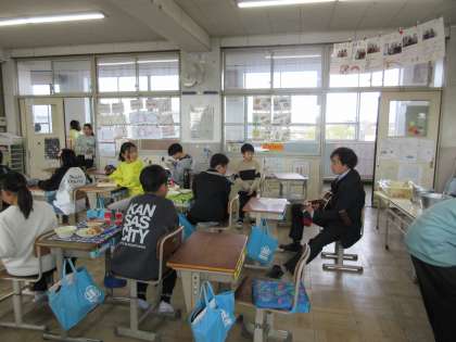 校長先生がギターで「わたしと、小鳥と、すずと」を弾いてくださりました。子どもたちも楽しそうです。