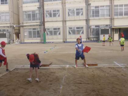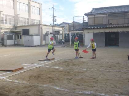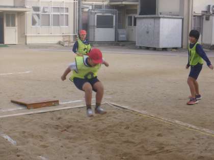 グループで準備をして、手際よく進めています。どのようにすれば、より遠くに跳ぶことができるのかを毎時間考えています。後半になると、記録も最初と比べてなかなか伸びません。考えるチャンスですね。