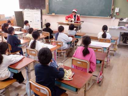 給食時間にサンタさんが歌のプレゼントを届けにやってきてくれました。みんな大興奮!一緒に楽しく歌いました。