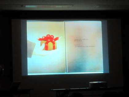真っ暗な中でスクリーンに映し出される絵本の世界に、夢中になっていました。