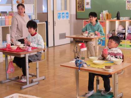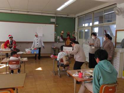 給食時間に、いきなりサンタたちがやって来てくれて、歌のプレゼントがありました。