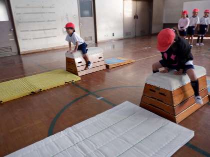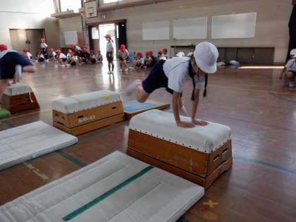 跳び箱の上に手をつく技あそびに挑戦しました。両足で乗り、ジャンプ!跳び箱の上にまたがる!横とびこし!新しい技も楽しくできました。