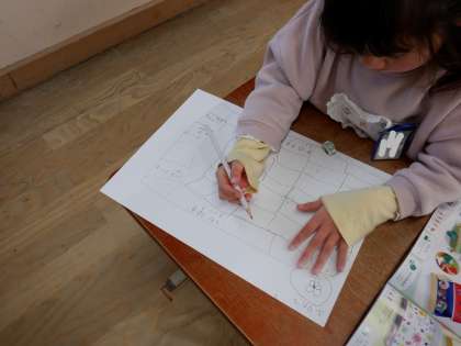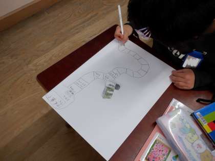 図画工作の時間に、おはなしすごろくを作りました。思い思いのすごろくの世界が広がっていました。試しにやってみると、とてもおもしろかったので、仕上げてからまた遊びたいです。