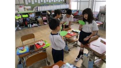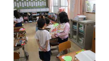 自分の好きなお話をカードにまとめました。その後カードに書いた内容を友達と交流し、友達からカードを読んで思ったことなどを、聞きました。