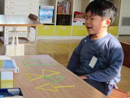 色板を並べていろいろな形を作ったり、木、風車、旗など、教科書の絵を見ながら棒を並べて形を作ったりしました。