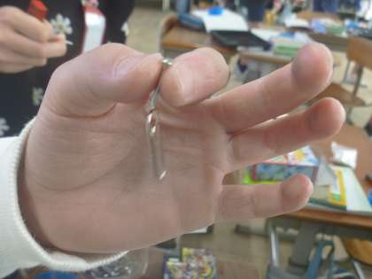 磁石に鉄クリップをひっつけると、もちろん引き合い、磁石につきます。さらに、磁石を離しても・・・つながったままのときもありました。とても不思議ですね。