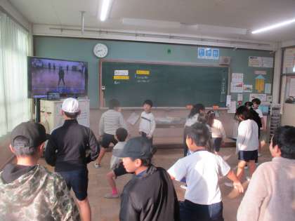火・木の朝の時間にけんこうチャレンジとして『あんたがたどこさ』をやっています。リズムに合わせてステップを踏むことで体をほぐしています。