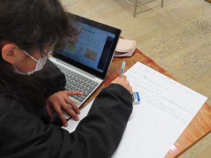 「豊かな自然を生かす宮津市」一人一人が、「どのようにして、美しい天橋立を取り戻し、守っているのか」を「海のこと」「松のこと」「砂浜のこと」「ゴミに関すること」など、関心がある順に調べています。同じテーマでも、調べたい理由が違います。教科書や天橋立学ぶっくを使って学習を進めています。