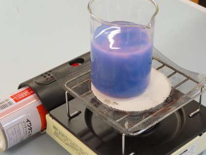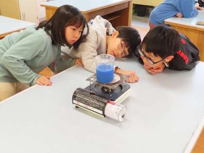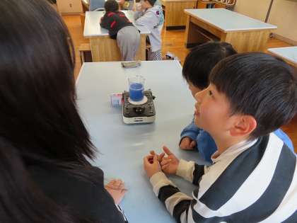 「ものの温まり方」水がどのように温まるかの実験をしています。示温インクを使うと対流の様子が目に見えてよくわかります。みんな興味深々で変化の様子を見ていました。