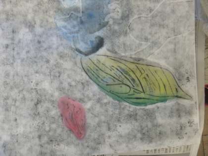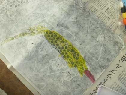 いよいよ版画が仕上がりました。絵の具で着色していくと・・・作品が色鮮やかになりました。
