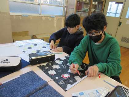 チャコペンシルで、布に印を付けました。紙と鉛筆とは違い、少し力がいりましたが、集中して頑張りました。