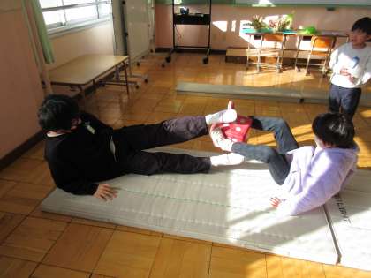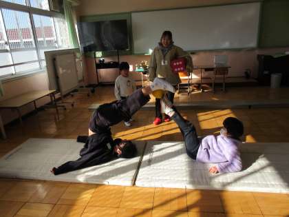 体の向きをくるっと回転させて、友達にサイコロやボールをパスする遊びです。