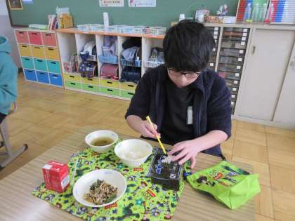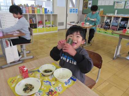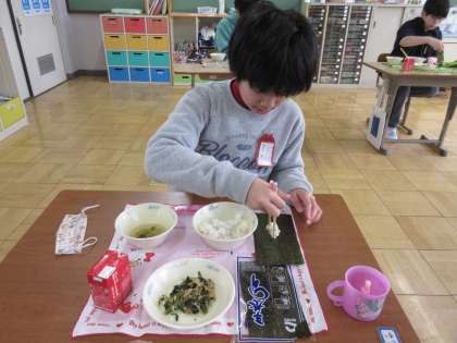 給食に、新献立「セルフおにぎり(キンパ風)」が登場しました。