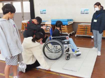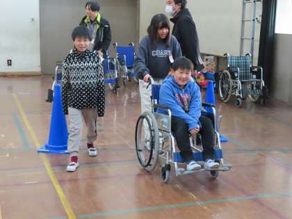「車椅子体験」段差に入るときに「あげるよ」や方向転換するときに「回すよ」など前もって声をかけて押すことの大切さを教えていただき実践しました。