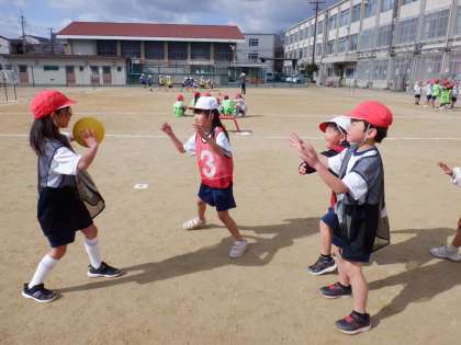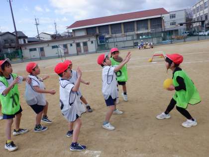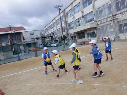 体育「パスゲーム」の様子です。まだ3回目なのに、とてもすばやく準備ができ、ゲームのルールもしっかり守って活動できました。すごい!!