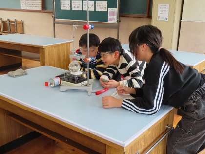 「水のすがた」水を温め続けるとどうなるのかを予想を立てた後実験をしました。温めると「ブクブクあわが出る」「湯気が出る」など生活の中での気づきから予想をし、2分ごとに温度の上昇記録と丸底フラスコ内の様子を観察しています。