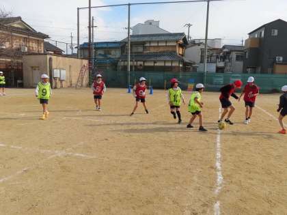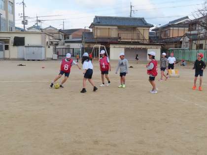 サッカーの学習に入りました。ゴールキーパーも決められる直前までプレイに参加したり、コート外の友だちもどうすることがチームにとって有効かを考えてたりしています。