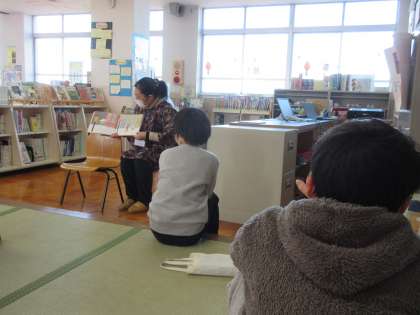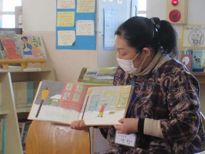 図書館司書の木曽先生に、『あっ!ゆきだ』という絵本の読み聞かせをしてもらいました。