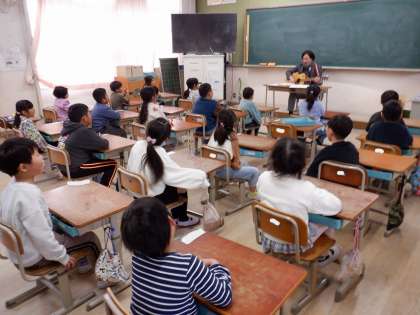 給食時間、みんなが食べ終わったころに、校長先生が来てくださいました。ギターの伴奏で一緒に歌えて楽しかったですね!