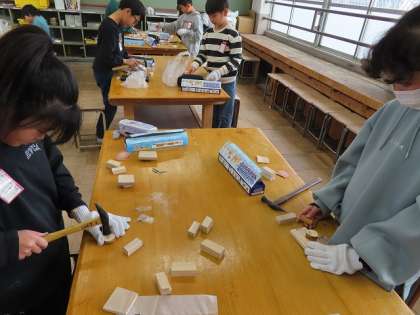全員がのこぎりの活動を終え、きれいに紙やすりをかけた後くぎ打ちに入り始めました。どんな作品になるのか今から楽しみです。