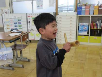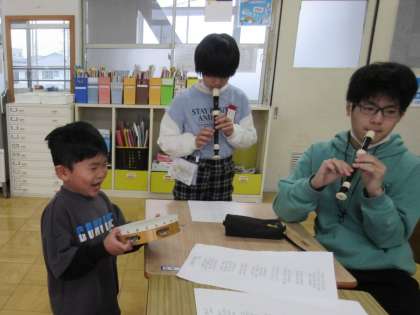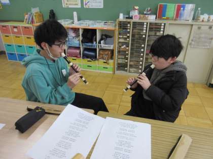 昼休みに5年生のひとりがリコーダーで『上を向いて歩こう』を練習し始め、どんどん仲間が増えて、3組全員でチャレンジ!1年生も打楽器を手に、楽しそうに演奏していましたよ。
