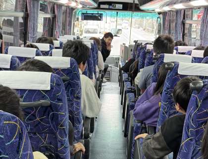 先生の話をしっかり聞いて出発。バスの中は楽しい雰囲気が流れています。モノレールを見て感激する人も!