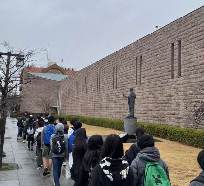 カップヌードルミュージアムに到着です。「安藤百福さんだ!」「マンホールがひよこちゃん!」いよいよ見学、楽しみです。