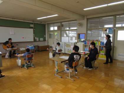 給食時間に、ギターを持った校長先生と、鍵盤ハーモニカを持った教頭先生が登場!