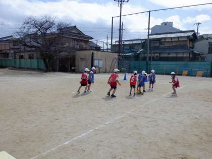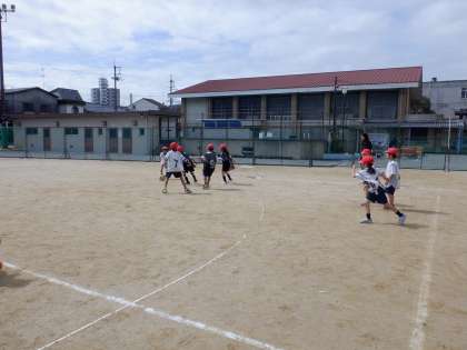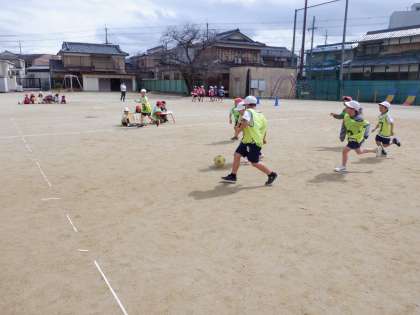 手を使ったパスではなく、ボールを蹴ってパスをするので、思い通りにいかないこともありましたが、空いている場所に走ったり、相手の前に行ってパスを邪魔したりすることは、「パスゲーム」の学習が生きていました。