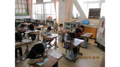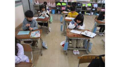 今回の書写では、「水筆」を使っての学習に取り組みました。水筆の場合、力を入れずにもつことが大切で、筆の力の入れ方一つで、文字の太さが変わることに子ども達は、とても驚いていました。
