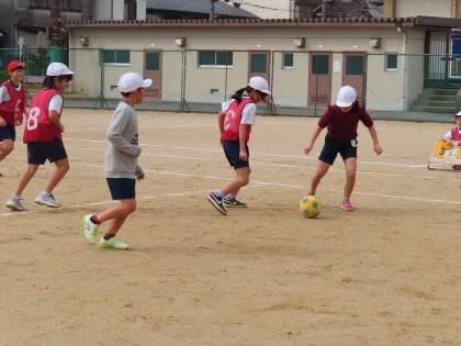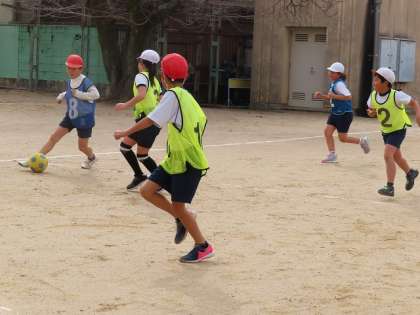 グループの友だちにボールを回せるようになってきました。コート外に出てる児童もボールの動きを追いながら、しっかりと参加しています。
