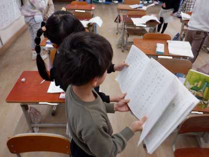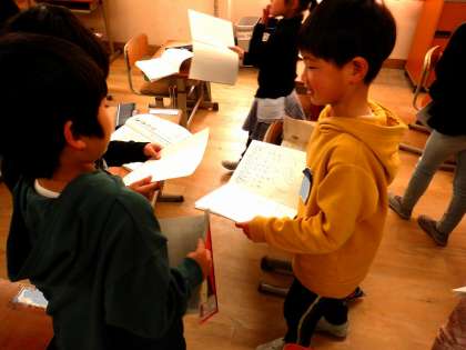 国語の教科書にある「ことばのたからばこ」の言葉を使って文を作り、友だちと読み合いました。いろいろな言い方で表現する楽しさを味わいました。