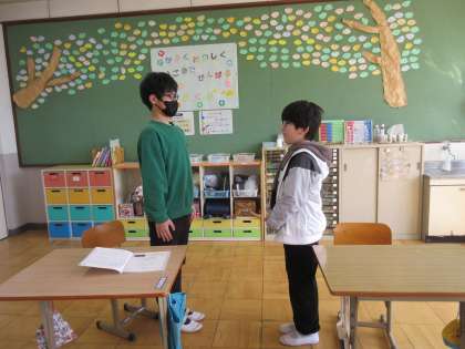 給食後、5年生が「起立」「着席」と自分たちで言いながら、卒業式の練習をしていました。