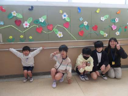 4月の掲示板に何を飾り付けるかみんなで相談し、春らしい植物や動物に決定!