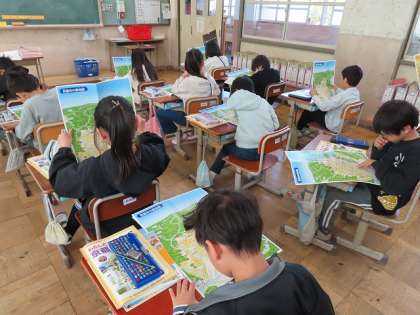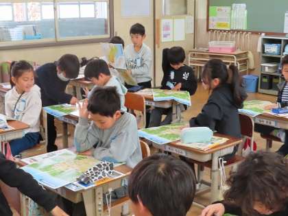 「社会科の時間にはどんなことをするのだろう。」子どもたちは、はじめての教科を楽しみにしていました。理科や社会科は、低学年の生活科とつながっています。淀の町から京都市の町の様子を学習します。教科書の目次を見て、内容を確認した後地図の中から「京都駅」や「競馬場」を見つけたりしました。