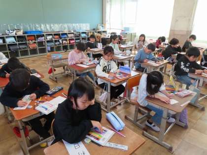 日直カードを作っています。毎日の日直が誰なのかが分かるように大きく書いた自分の名前の周りに思い思いの絵や模様を描きました。