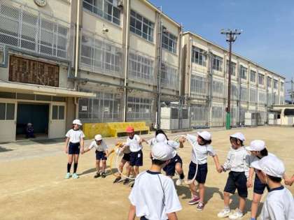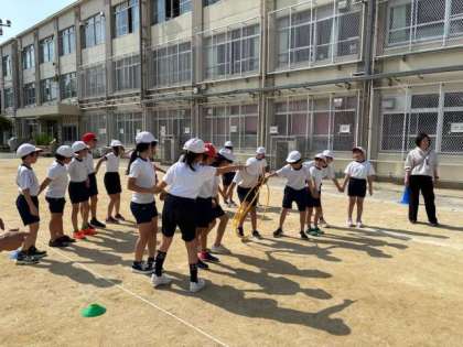 今日はグラウンドに出て、体つくり運動に取り組みました。1列になり手を繋ぎ、フラフープをくぐっていき、全員が通れるように協力しました。人数を増やすとその難しさが変わり、みんなで楽しむことができました。
